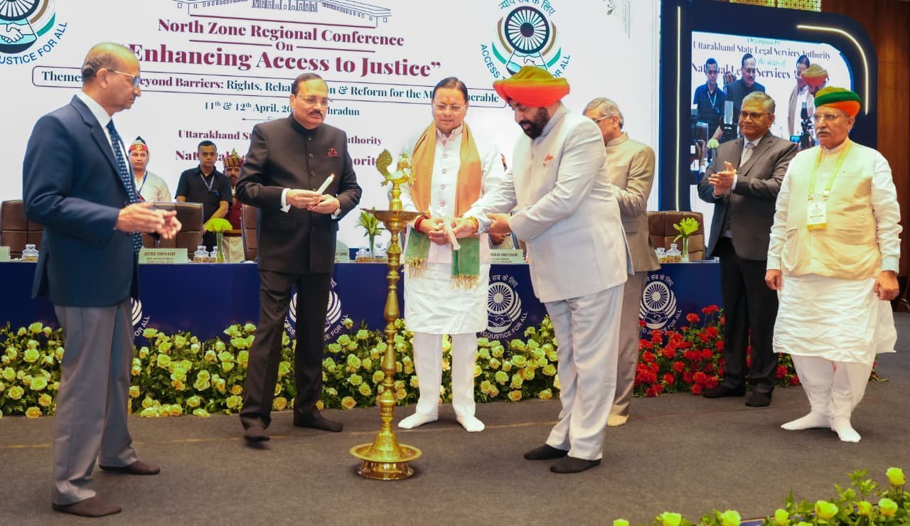 देहरादून। राष्ट्रीय विधिक सेवा प्राधिकरण (नालसा), नई दिल्ली के तत्वाधान में उत्तराखण्ड राज्य विधिक सेवा प्राधिकरण, नैनीताल द्वारा देहरादून में आयोजित दो दिवसीय नॉर्थ ज़ोन रीजनल कॉन्फ्रेंस का आज दिनांक 12 अप्रैल 2026 को भव्य समापन हुआ। इस वर्ष सम्मेलन का विषय “Enhancing Access to Justice” तथा मुख्य थीम “Justice Beyond Barriers: Rights, Rehabilitation & Reform for the Most Vulnerable” रही। इस सम्मेलन के समापन के अवसर पर राज्यपाल लेफ्टिनेंट जनरल गुरमीत सिंह (से नि), माननीय भारत के मुख्य न्यायाधीश एवं नालसा के संरक्षक-प्रधान न्यायमूर्ति सूर्यकांत, मुख्यमंत्री पुष्कर सिंह धामी, केन्द्रीय विधि एवं न्याय राज्य मंत्री (स्वतंत्र प्रभार) अर्जुन राम मेघवाल सहित उच्चतम न्यायालय एवं उत्तराखण्ड उच्च न्यायालय के माननीय न्यायमूर्तिगण, उत्तर भारत के विभिन्न उच्च न्यायालयों से पधारे माननीय न्यायमूर्तिगण और विधि विशेषज्ञों ने प्रतिभाग किया।